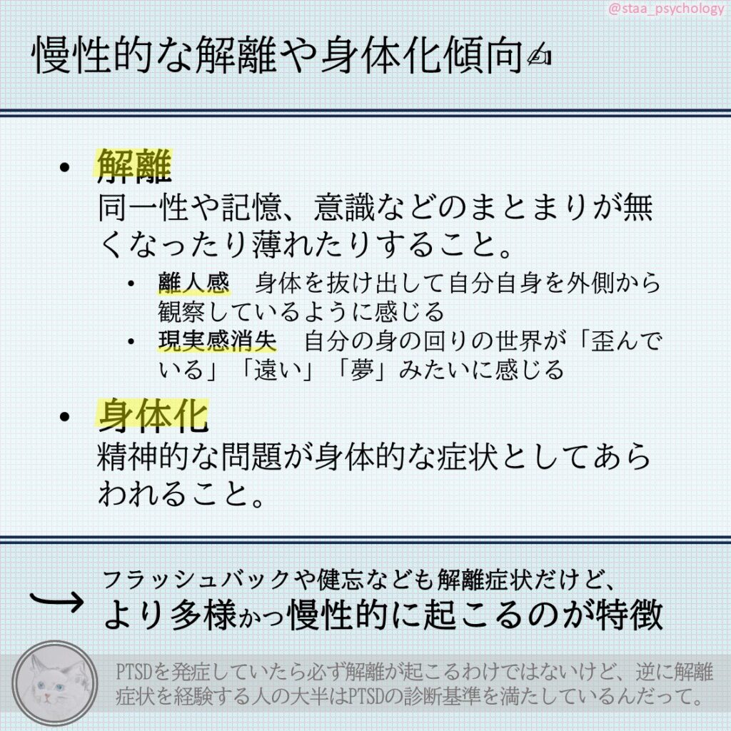 国際的な調査によるとPTSD患者の約15%が離人感と現実感消失の症状を有しているとされていて、PTSDを発症しているすべての人がこうした解離症状を経験するわけではありませんが、反対に、慢性的に解離症状を経験する人の大半はPTSDの診断基準を満たしていると言われています。