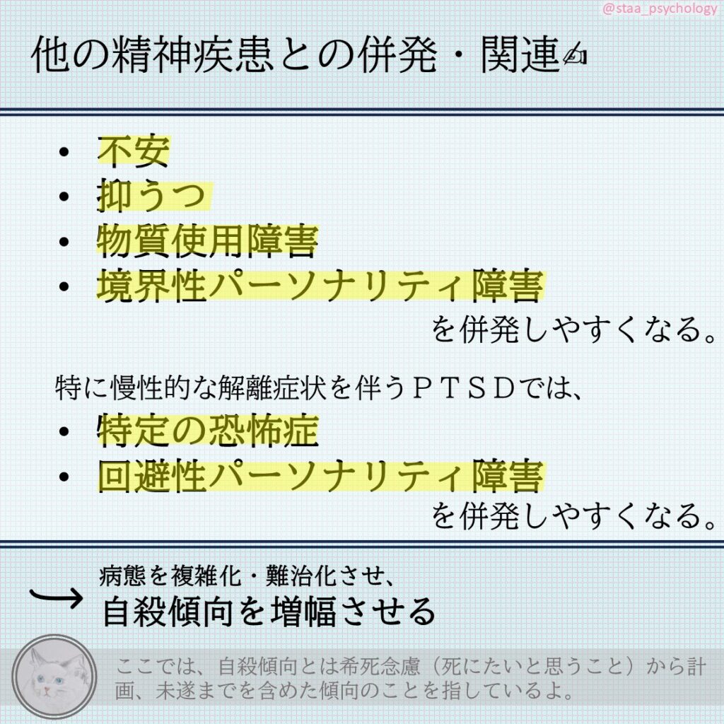 また、境界性パーソナリティ障害との併発も多く認められ、特に解離型PTSDでは、それに加えて恐怖症回避性パーソナリティ障害の併発も多く見られます。