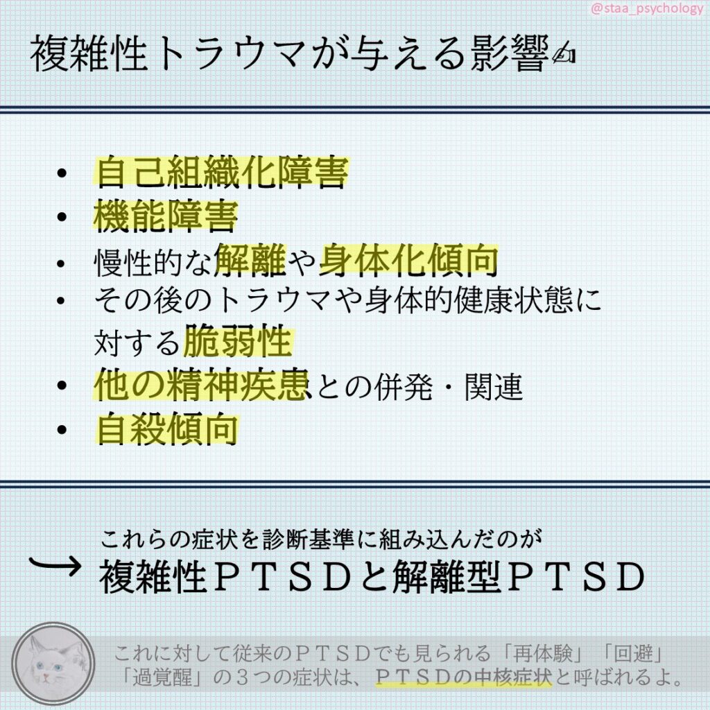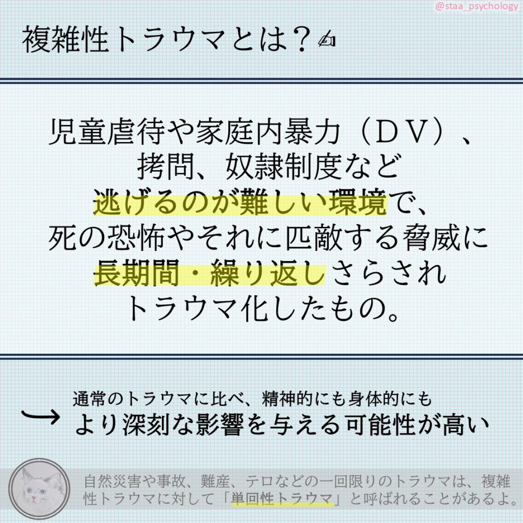 • 児童虐待や家庭内暴力(DV)、拷問、奴隷制度、戦場でのサバイバルなど、逃げるのが難しい環境で、死の恐怖やそれに匹敵する脅威に長期間・繰り返しさらされトラウマ化したものを複雑性トラウマ