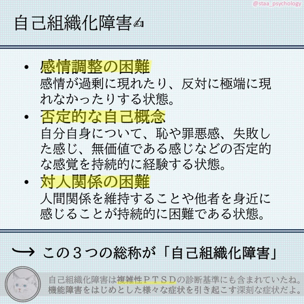 感情調整の困難否定的な自己概念対人関係の困難の3つは、総称して自己組織化障害と呼ばれています。