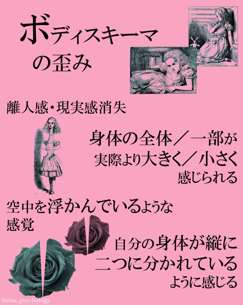 前々回の記事でまとめた「離人感・現実感消失」に関する当事者アンケートの結果では、「体の位置やサイズがわからなくなる」「手や足が丸太や木の枝になったような感じ」といったボディスキーマの歪みと解釈できるような症状から、「視界の色味が変になる」「水槽の中から見ているように感じる」といった視知覚の歪み、「時間の流れがゆっくりになる」といった時間感覚の歪みまで、不思議の国のアリス症候群と重なる病態が多く報告されました。