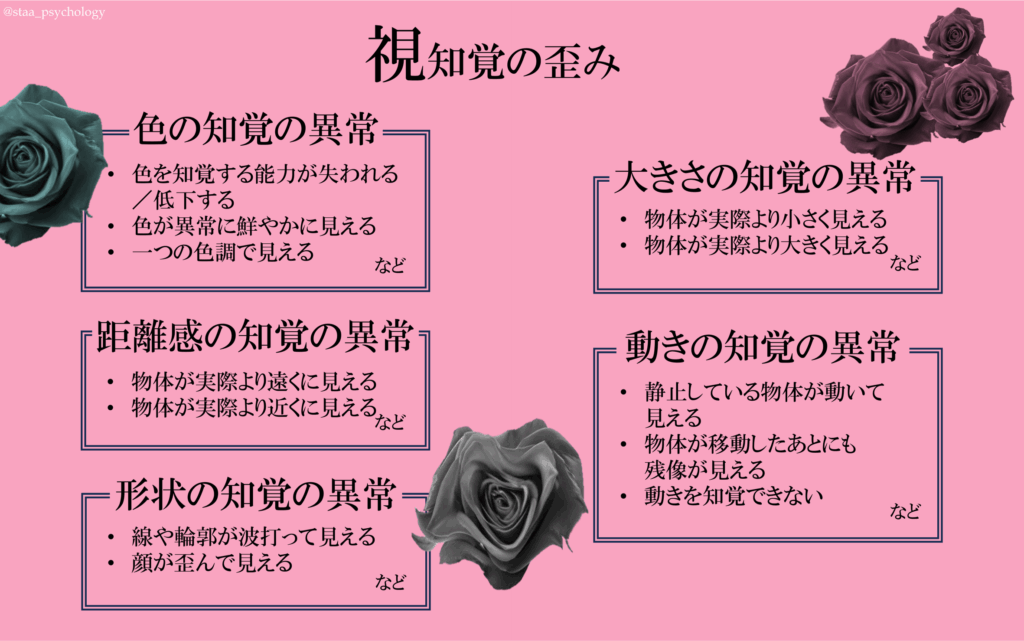 つまり、統合失調症や薬物使用で起こる幻覚のように「何か実在しないものが見えたり聞こえたりする現象」や、トラウマ記憶が引き起こすフラッシュバックのように「平凡な刺激が恐ろしい被害記憶の影を感じさせるトリガーとなる現象」など、視覚に異変が生じる症状はもちろんたくさんありますが、そうしたものと不思議の国のアリス症候群で見られる「歪み」とは、本質的な性質が異なるということですね12。